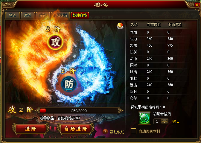 2、消耗命格丹,可增加命格经验,乾坤命格经验进度满后,会提升阶数,并立刻提升属性。