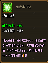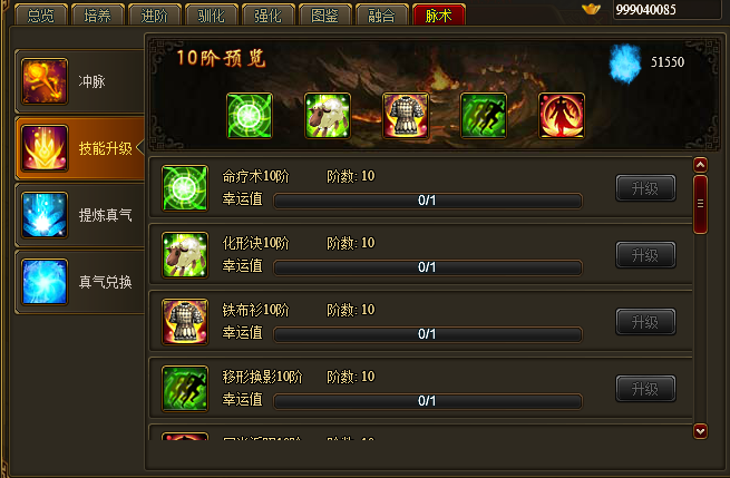 1.技能介绍:冲脉3、6、9、12、15级成功之后,会相应的获得五个1阶技能(命疗术、化形诀、铁布衫、移形幻影、回光返照),通过消耗真气和铜钱可使技能升级,技能满阶为10阶。技能升级会提升技能触发概率,并且10阶技能会加强技能效果