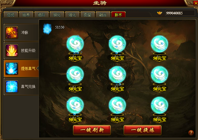 3.刷新消耗:消耗50元宝可一次刷新9个提炼球