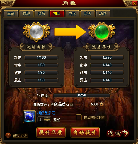 每次提升都要消耗铜币和一定数量的初级品质石或者高级品质石。