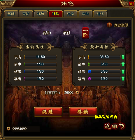 通过消耗铜币可对神兵进行洗炼,提升神兵对角色属性的加成。
