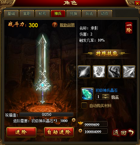 触发几率:神兵品阶越高,触发神兵伤害的概率越高,成功触发神兵伤害,可提升1点熟练度。