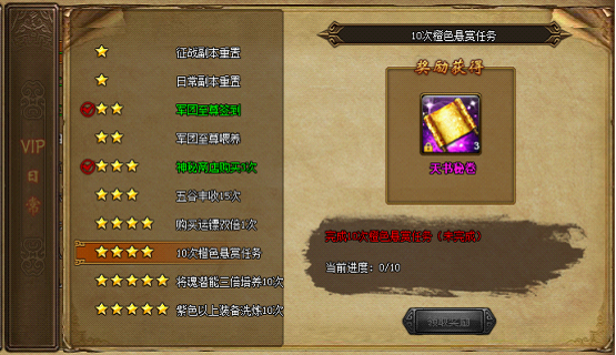 只有VIP星级达到该日常的星级要求方才开启,该日常每天有1次完成机会,奖励丰厚,专属特权助您实力更上一层!