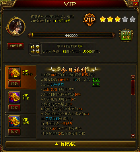 半年VIP玩家除了享有之前的所有特权,更能获得星级上的提升。半年VIP的星级越高,可开启更多的VIP专属日常,完成后可获得丰厚的奖励。