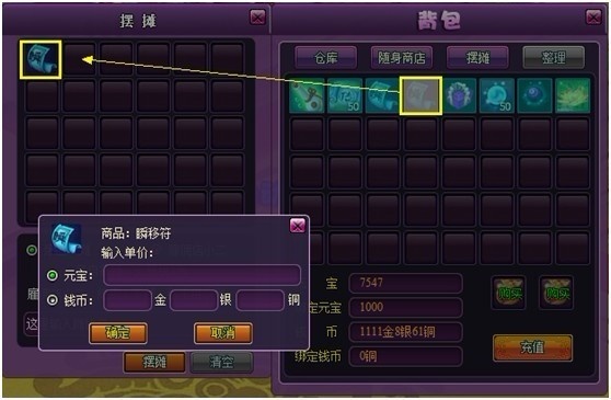 1、提取摆摊收益:如果有人购买了你的道具,就可以在摆摊界面的右上角的『提取』按钮处领取自己赚到的元宝或钱币。