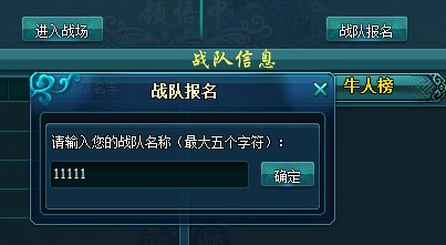 4、点击报名后,队长可以输入自己的小队名,其他两名队友点击确认后报名成功,系统自动记录当前玩家的属性