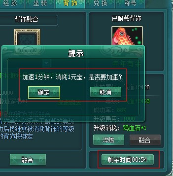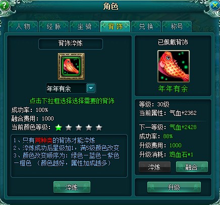 消耗鸡血石可以升级背饰,成功率每小时刷新一次