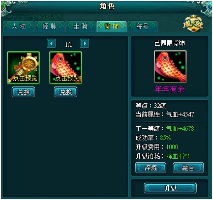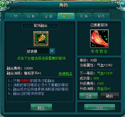 即:玩家原有一个50级紫色的“年年有余”,现在获得了一个30级紫色的“拨浪鼓”,玩家可以把“年年有余”融合到“拨浪鼓”上,玩家最后获得一个50级紫色的“拨浪鼓”