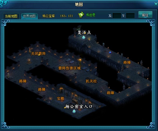 这一层为队伍地图,同一队伍的玩家在一张地图内,地图中央有箭阵伤害区域,玩家进入该区域将受到万箭齐射的伤害,被秒杀,消灭箭阵前的机关柱或者在箭阵后的NPC处关闭箭阵(如何通过箭阵去关闭开关,答案在阴葵技能上),即可安全通过。