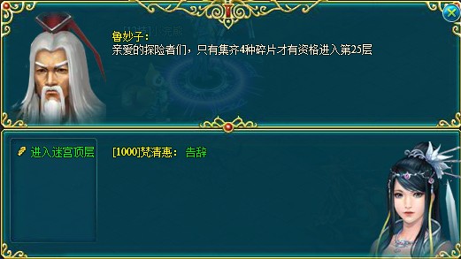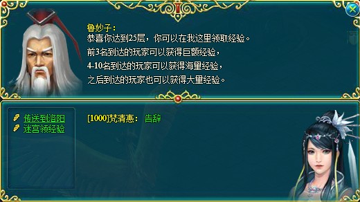 在第5、10、15、20、25层,经验奖励使者-鲁妙子大师会出现,对话后选择迷宫领经验,可以获得大量经验,地图中还会刷新宝箱,采集后获得迷宫地图残券(采集这四层的宝箱,获得的碎片是不同的,需要四种碎片才能进入25层)