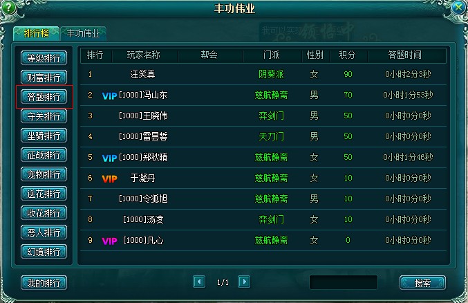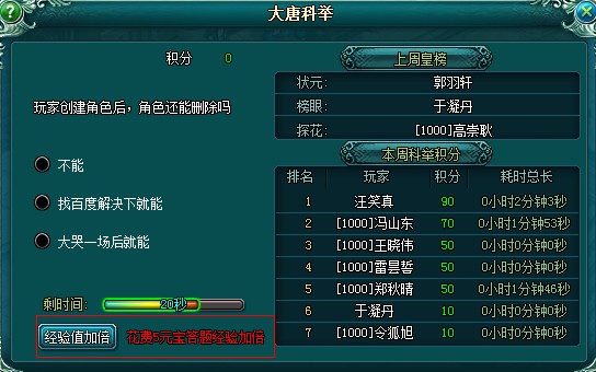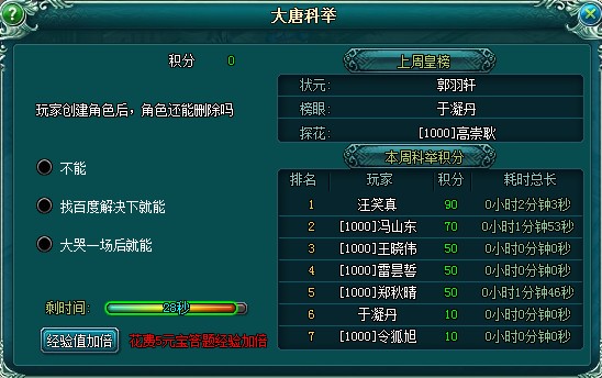 答题排行榜会显示答题前八名的玩家,周日晚上20点,排行榜记录结果,不能再进行答题,系统会对前三名玩家发放“状元”、“榜眼”、“探花”称号