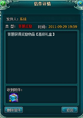 答题完,系统会根据玩家答题的情况进行奖励,通过邮件发送礼盒