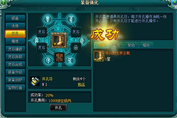 装备开孔主要是通过开孔符在装备上打孔,玩家可对装备进行开孔,开孔时有一定的几率在装备上打出孔,同时要消耗开孔符,橙色装备最多可开五个孔,其他装备最多可开四个孔,打过孔的装备才可能镶嵌宝石。