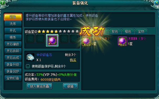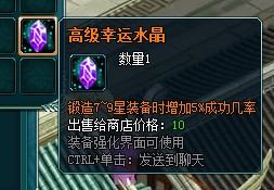 锻造时使用幸运水晶,提升锻造的成功率,最多使用4个,幸运水晶分为两种:中级幸运水晶(锻造4-6星装备增加5%成功率)、高级幸运水晶(锻造7-9星装备增加5%成功率)