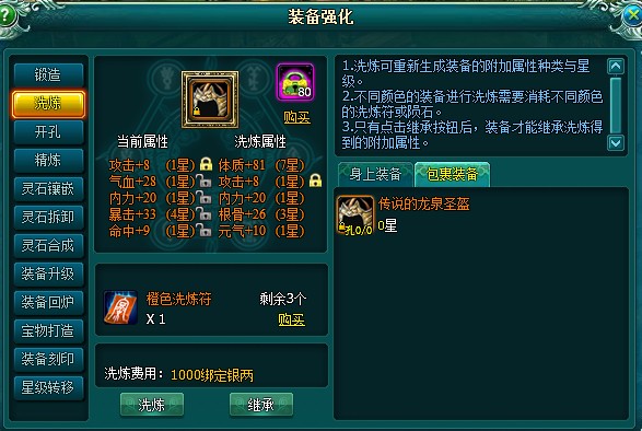 玩家可通过洗炼改变装备的附加属性,每次洗炼相当于重新为装备生成附加属性,有可能洗炼出更好的属性,也有可能洗炼比原先低的属性,所以洗炼前要考虑清楚,装备洗炼要有“洗炼符”才能进行洗炼。
