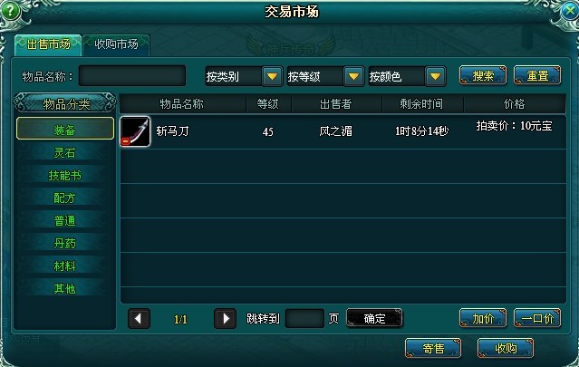 交易市场分为出售市场和收购市场,可以购买正在拍卖的物品、也可以寄售银两、元宝、装备等其他物品,也可以进行物品收购。