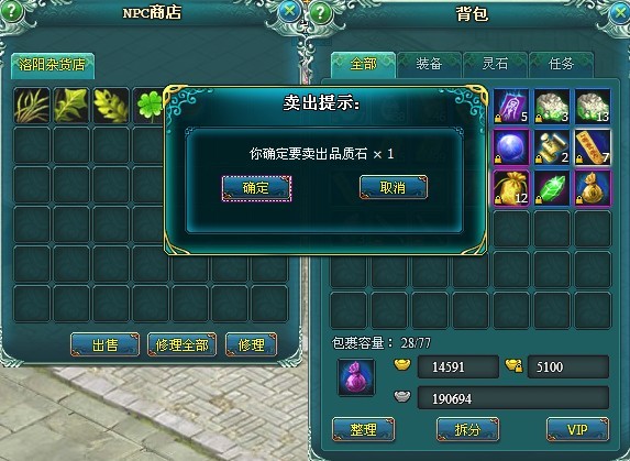 卖东西:在背包中拉动需要卖出的物品到卖出窗口,点击确定出售,交易则完成;也可以用商店出售按钮,点出售按钮,鼠标焦点会变为出售焦点,只要点下要出售的物品,然后点击确定出售,一样可以完成交易。
