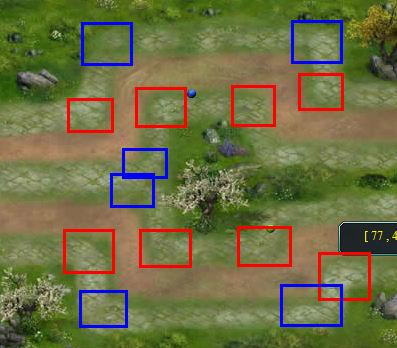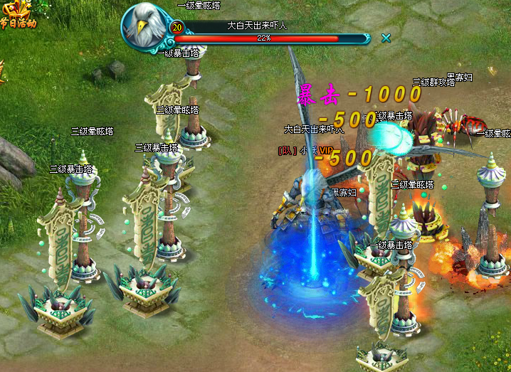 下图为20波BOSS到来时A玩家建塔示例,此时拥有2个三级暴击塔、3个三级眩晕塔: