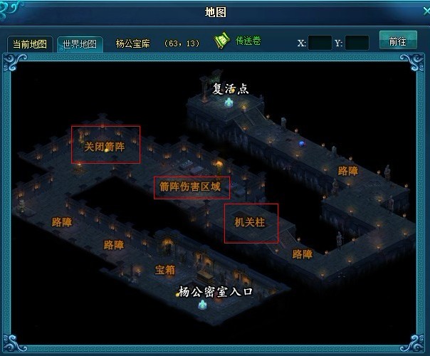这一层为队伍地图,同一队伍的玩家在一张地图内,地图中央有箭阵伤害区域,玩家进入该区域将受到万箭齐射的伤害,被秒杀。所以,记得先去消灭箭阵前的机关柱或者在箭阵后的NPC处关闭箭阵(如何通过箭阵去关闭开关,答案在阴葵技能上),方可安全通过。