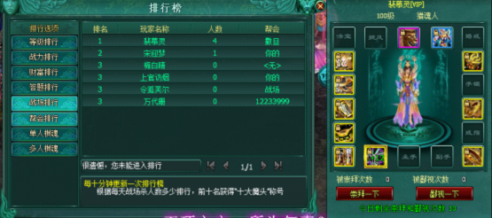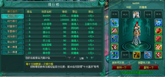 排行榜有 等级排行、财富排行、战力排行、杀手排行、战场排行、答题排行、等8个排行分类
