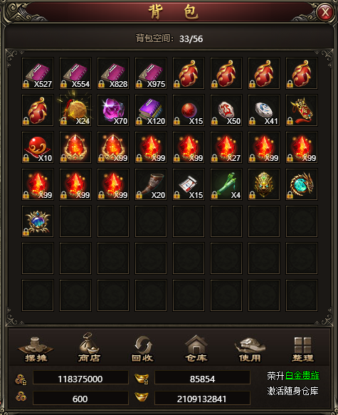 背包里的道具装备混乱的摆放,中间空出许多格位,不要难受,一键整理,背包立马变得清爽