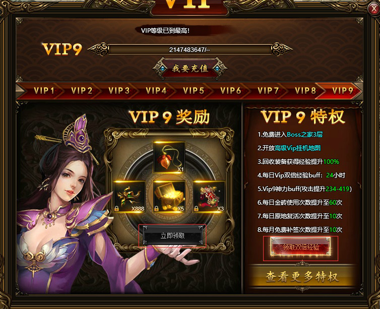 1.玩家在游戏中充值即可获得VIP经验,经验值满时VIP等级将会升级