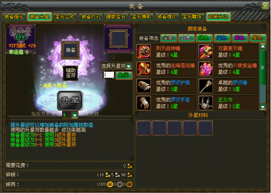 装备的升星规则和强化的规则一样,有一定几率失败,升星到1、2、3、4、7、9之后不会再回退。并且在失败之后会有依据强化符的数量给予0.25%的失败加成。