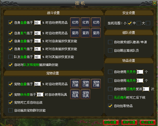 在挂机过程中,可以选择药品自动补血功能。将包裹中的红蓝药、宠物药拖到相应的方框内,挂机时会自动为玩家和宠物进行补血补气。挂机时,会自动捡取怪物掉落的所有物品。