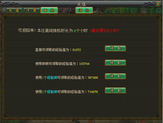 玩家可以根据自己需要选择相应倍数的离线经验奖励。每次最多可以累积离线挂机 8 小时 ,最多获得8 倍经验 。多倍经验需要用碎银或逍遥丹兑换,其中逍遥丹是商场元宝购买物品。