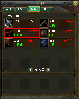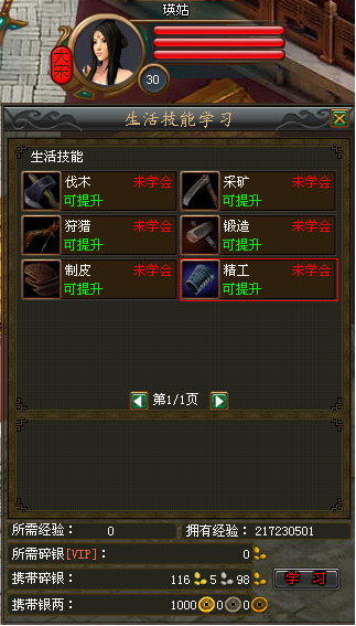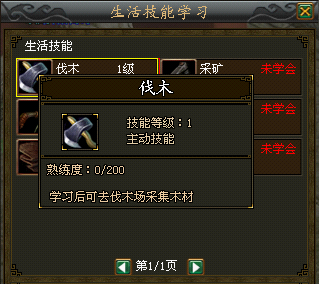 点击自己所需的技能学习即可。可以学习的技能一共有伐木、采矿、狩猎三种,学习1级的技能后,再升级需要采集熟练度、经验和金钱。