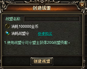 角色等级≥30级,消耗100000金币或消耗一枚战盟令完成创建。