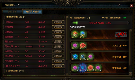 军功任务无需领取,与玩家的游戏操作息息相关,比如说积累真气、为神树浇水、击杀BOSS、进行点绛唇等这些十分日常的操作都有其对应的军功。已完成的军功任务会以绿色字体显示,而没有完成的则会以红色字体显示。当每日积累的军功达到一定数量,还能获得红玫瑰、真气丹、坐骑进阶丹、双倍收益丹等元宝道具作为奖励哦!