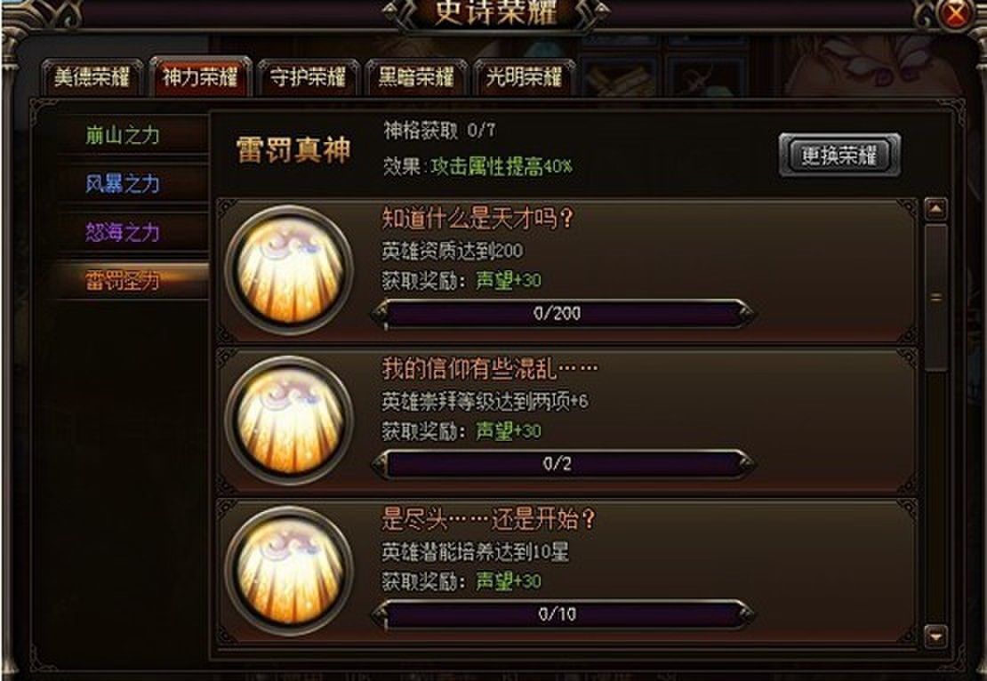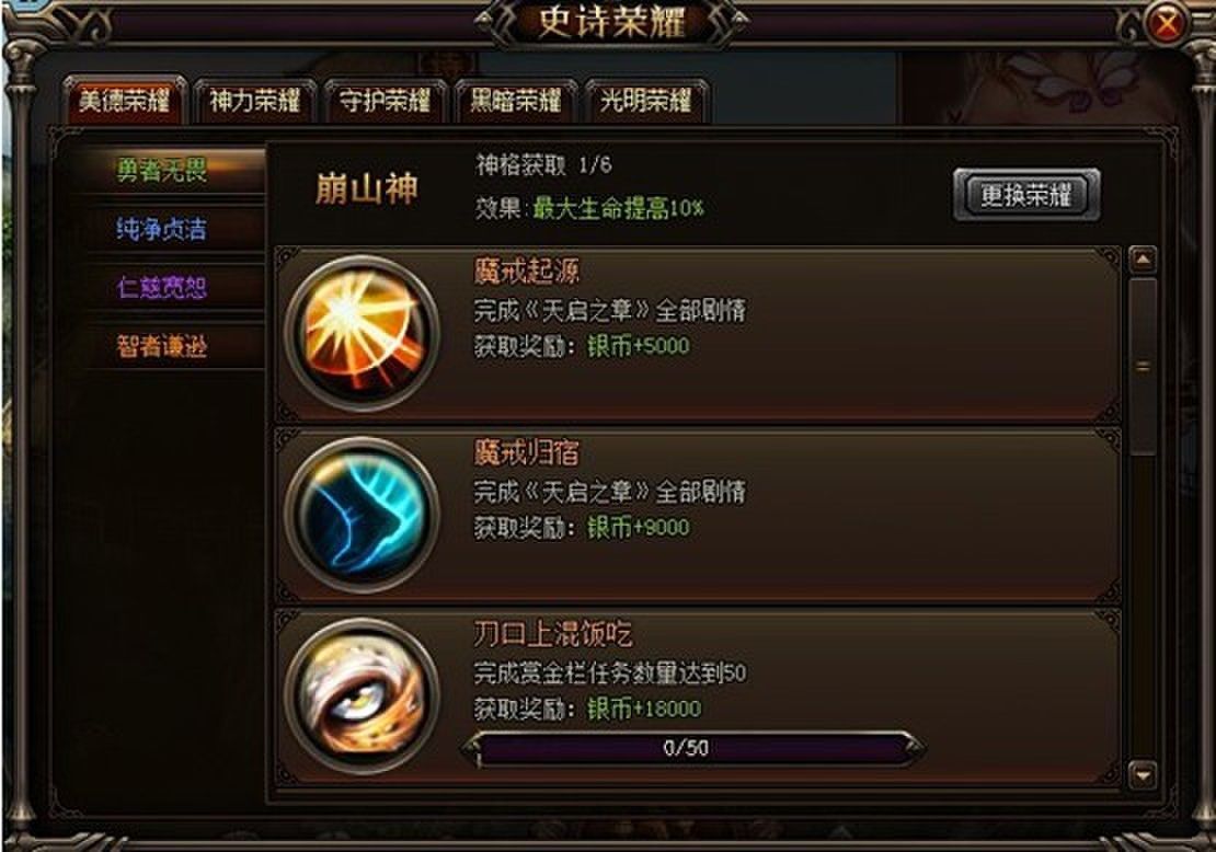 荣耀成就系统界面有5个页签,分别为:美德荣耀、神力荣耀、守护荣耀、黑暗荣耀和光明荣誉。在这5个页签之下又分为数多的荣耀,每个荣耀对应众多的成就。