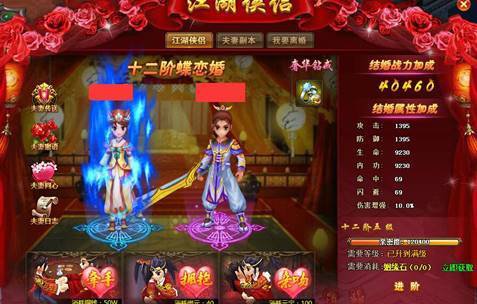 目前侠侣系统刚开服出来大家可能还不了解情况,所以小编这边就为大家讲解一下。这次师说属性加成,相当于其他的系统小编建议大家可以考虑优先使用资源来升级侠侣系统。因为侠侣系统加成的属性是非常高的,满12阶5级加成1395的攻击和10%的伤害增强,这个是非常可观的数据,另外还有9230的生命值加成。除了亲密度升级加成还有我们的戒指加成,这个加成也是很可观的。所以目前侠侣系统的主要加成是使用亲密度和姻缘石升级加成的哦,所以大家每日的动作和夫妻副本都不要忘记哦。