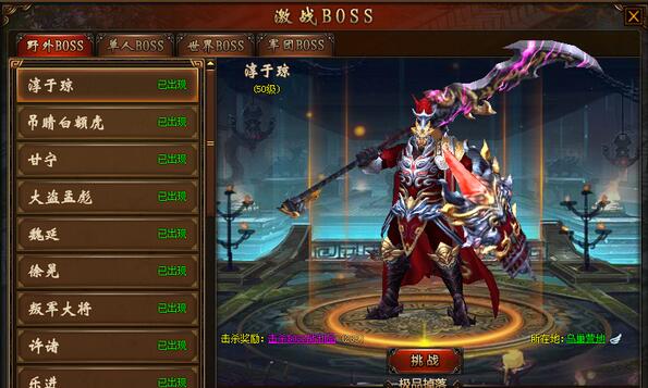 单人boss每个玩家每天只能挑战一次,无论成功或者失败都需要等待第二天次数重新刷新。挑战单人boss成功可以获得大量战功、神兵之魂以及橙色极品武装。