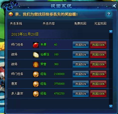 游戏界面右上方“找”按钮进入找回系统。 若没有可以找回的奖励,无法打开哟~