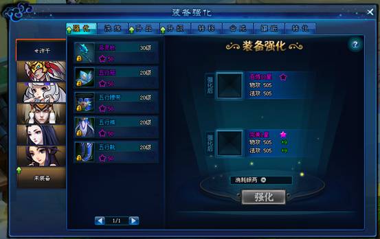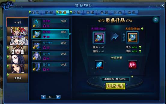 每个角色的装备将通过打造逐级升级。升级装备需要装备升级卷轴+玄天石,成功率100%。打造成功后,装备的主属性将大幅度提高。