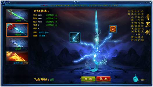 剑本凡铁,因气而动,因人而灵!大部分飞剑都是由修道者收集天材地宝,依靠宝物自身的灵力精炼而成,材料越好、炼制者的法力越高,则飞剑威力越大。剑成 之后,瞬息千里,取人首级于千里之外,发招之时更是千变万化、炫丽非常。在蜀神世界中每一把飞剑都有其独特的来历和作用,玩家可以在战斗中召唤出飞剑帮助 战斗,往往能够起到一锤定音的效果!