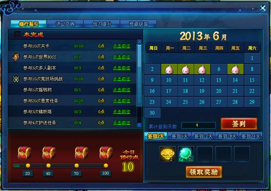 修行点——每日完成指引的游戏内容,将获得修行点,修仙点达到一定额度,将可以开启修行宝箱。领取丰富的奖励。
