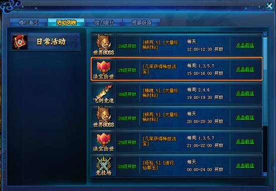 游戏右上方出现“活跃指引”的图标。点开这里,随着等级的提升,会陆陆续续出现相应的“修行指引“、“活动列表”指引、战力以及资源获取的指引。