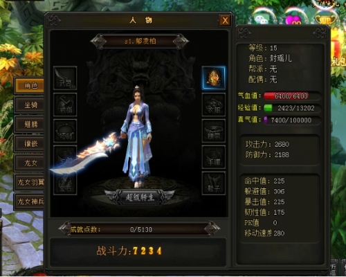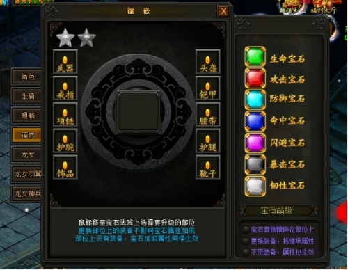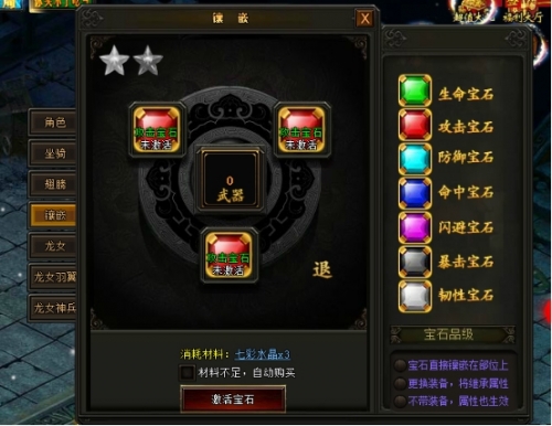 人物界面上一共有人物属性面板、坐骑、翅膀、龙女、龙女神兵、龙女羽翼、镶嵌、几大丰富玩法! 每一项都有巨大的提升潜质,为角色增加大量的战斗力。