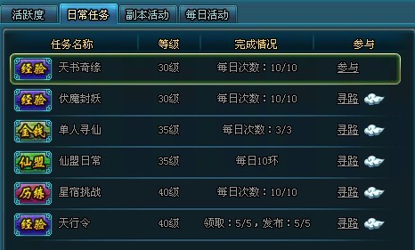 做这些日常任务时,用完了之前副本里得到的刷新令牌和符的时候,天书奇缘是可以用铜币刷到5星的就直接用铜币刷,伏魔封妖要是令牌不够就等那个免费刷新,不要急着做完连白色任务也接,单人寻仙要等中午3点时再做那时给的“经验和铜币都是双倍”,星宿挑战50级后用铜币把总历练刷到8万以上再接,天行令这个令牌发布要是没人发,就自己有令牌就一个个发,自己发一个接一个,完成后在来发第二个,不要一时全发了,那样别人接了等下你回来领时要是没有就只能去领紫色的了。平常不要开1.3倍或是1.6倍去挂机,1.3倍或是1.6倍做副本时在用,每天的“活动”有时间跟上就跟上,没时间就算了,但最好是跟上,因为组的经验都满多的,还有