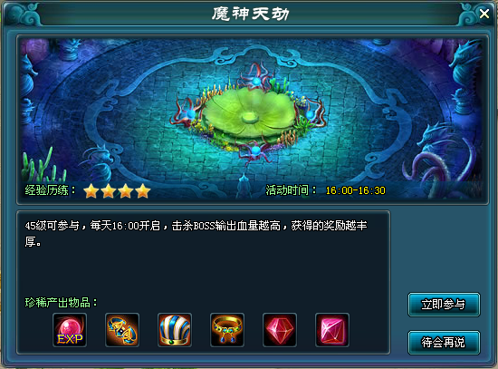 每天的16:00分都会开启魔神天劫,进入场景后即可开始攻击魔神,根据对魔神造成的伤害来产生排名。排名靠前的玩家还有机会获得额外的奖励,给予魔神最后一击的玩家可获得巨额奖励。