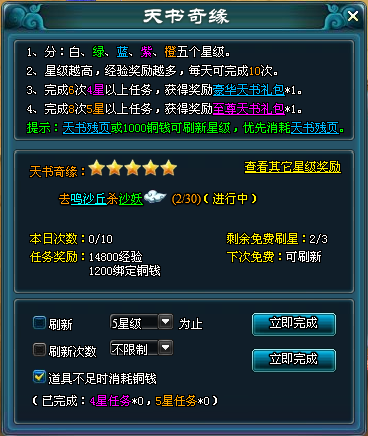 仙友们每天在活动或者在可接任务中可以点开天书奇缘面板,任务未达到五星之前可以用天书残页或者1000铜币刷新星级。任务领取后就不能刷新了哦。每天完成一定次数的四星以上的任务还会获得额外的奖励:豪华天书礼包与至尊天数礼包。