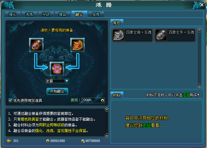 2、只有橙色防具套才能融合,武器套饰品套不能融合。