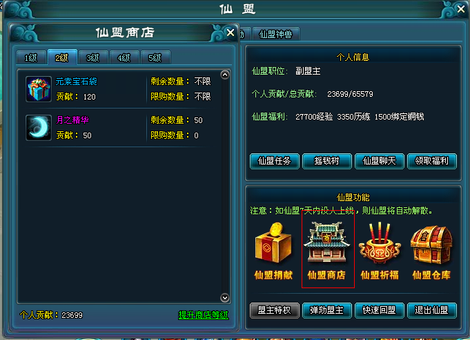 打开仙盟界面然后就点击仙盟商店开始购买想要的物品。包括元素宝石袋,月之精华等极品道具。
