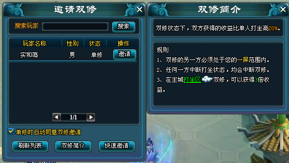 当人物进入打坐状态后,前方出现【双修】和【历练】的按钮,点击【双修】按钮即可看到附近其他打坐玩家,点击邀请,待对方同意后即可进入双修状态。