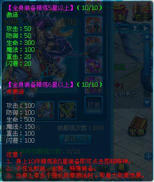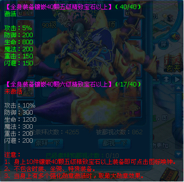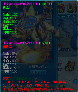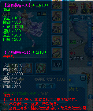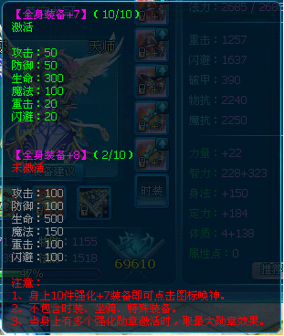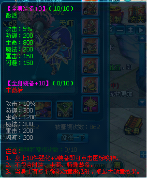 全身装备强化加7之后,就能点亮装备的强化唤神,点亮加7唤神是需要使用100元宝,越高级的强化唤神使用的元宝也是越多的。加7唤神的属性:攻击+50,防御+50,生命+300,魔法+100,重击+20,闪避+20。强化的装备等级越高,唤神的属性加的越多。强化唤神最高是强化12的唤神。