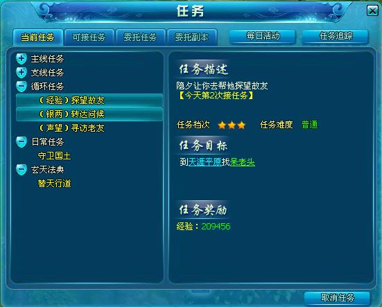 非VIP和vip2以下玩家接到任务后全部点取消,有必要提一下的是,中间会出来让你提交蓝药,红药,经验符等道具的,出来这个直接交掉,而且不扣东西!这个取消任务是不减少次数的,你第几次取消,取消后在接在还是在第几环!