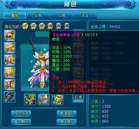 2、装备强化;装备强化是提升装备的必要条件,如果全身装备加到7-12都会获得不一样的属性加成,关于装备怎样强化,我以前说过了,在这里我从新给大家说一下,装备+7很简单,首先把所有的装备用初级强化石加到4,剩下的5-7就需要用中级强化石了,也是最容易掉级的时候,这个时候,我们就需要垫手了,装备上5很容易,上6有点困难,如果点了2次没上去,这时候就把另外的装备往上加,如果别的装备上了6这个时候就吧之前掉级的装备再上一次,这时候有很大几率会失败,一旦失败立刻去加+6的装备,有很大几率成功,如果打上7及强化幸运石,这时候成功率会达到78%左右,加上之前的垫手,我想不会失败了吧。我在这里只说了一件装备的强化方法,剩下的也可以这样,然后说+8,这个就有点困难了,还是老办法垫手,吧一件买的普通装备,加到失败,只要失败立刻上加 7的装备,还有另外一种方法,就是看别人在冲击8或者9的时候,对方一直失败的话,这时候抓紧时机立刻加8,积累别人的失败率也是垫手的一种方法,加9很好用。